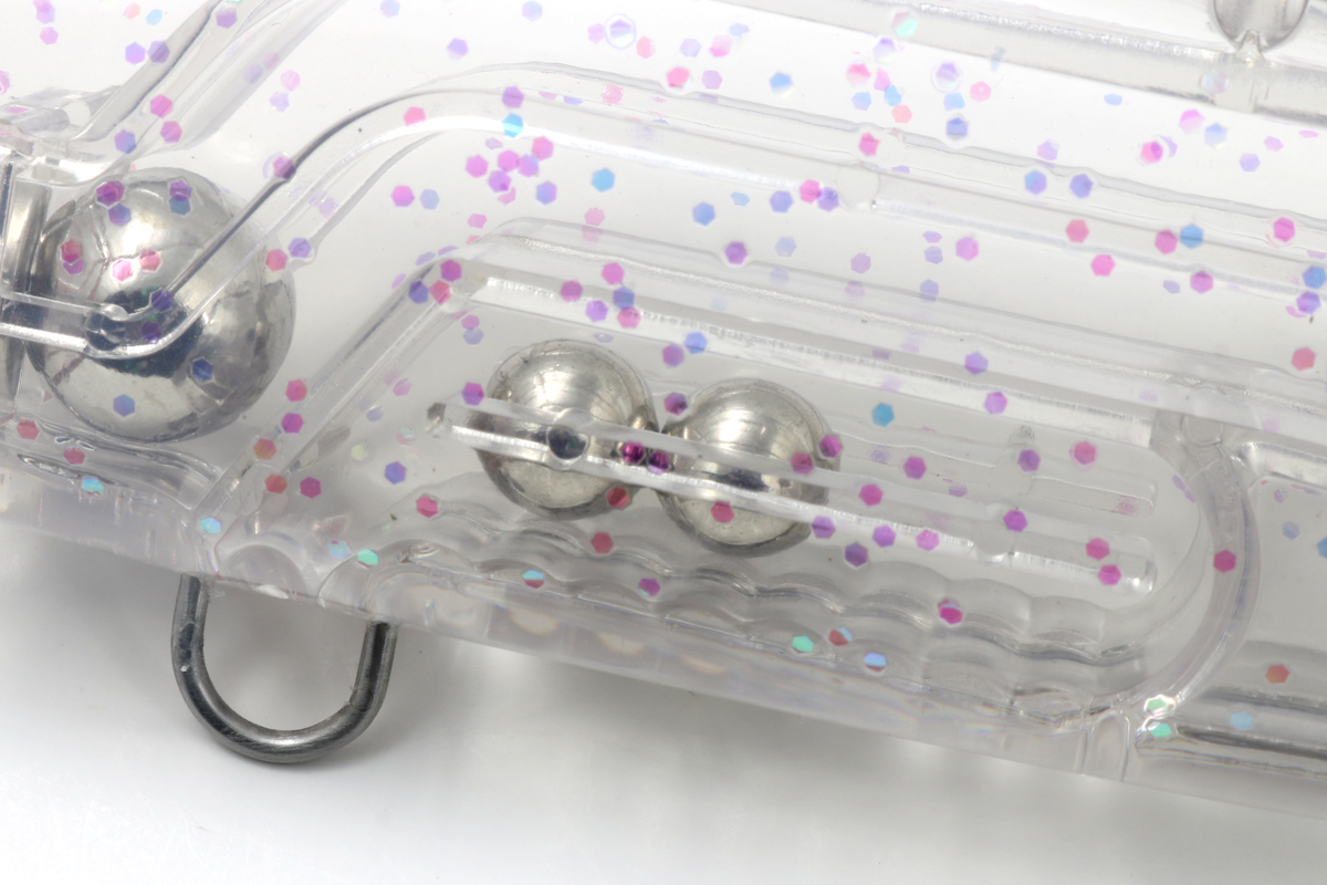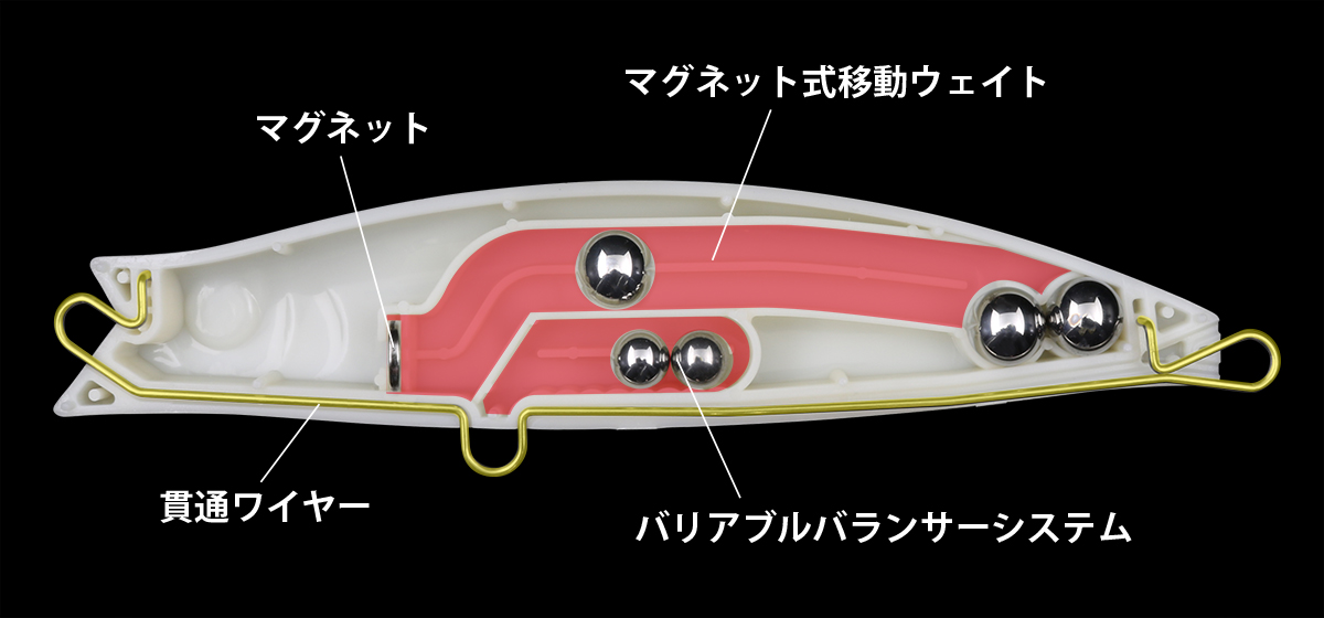 姿勢変化により発する独自のバンピーサウンドでアピールするバリアブルバランサーシステムと、追い込まれ逃げ惑うベイトを思わす気泡を纏うダイビングから、体高のあるフラットサイドによる明滅効果と水押しを生むロールアクションでフィッシュイータ一の捕食本能を刺激。