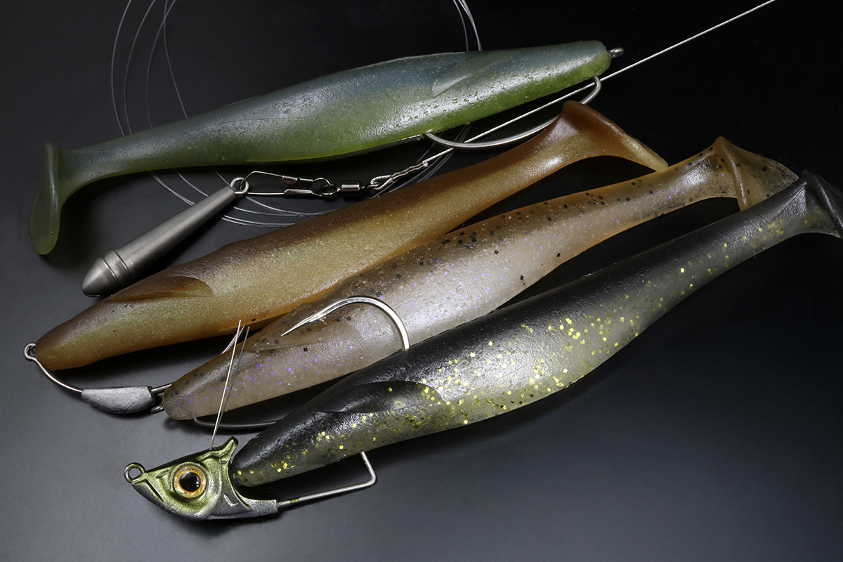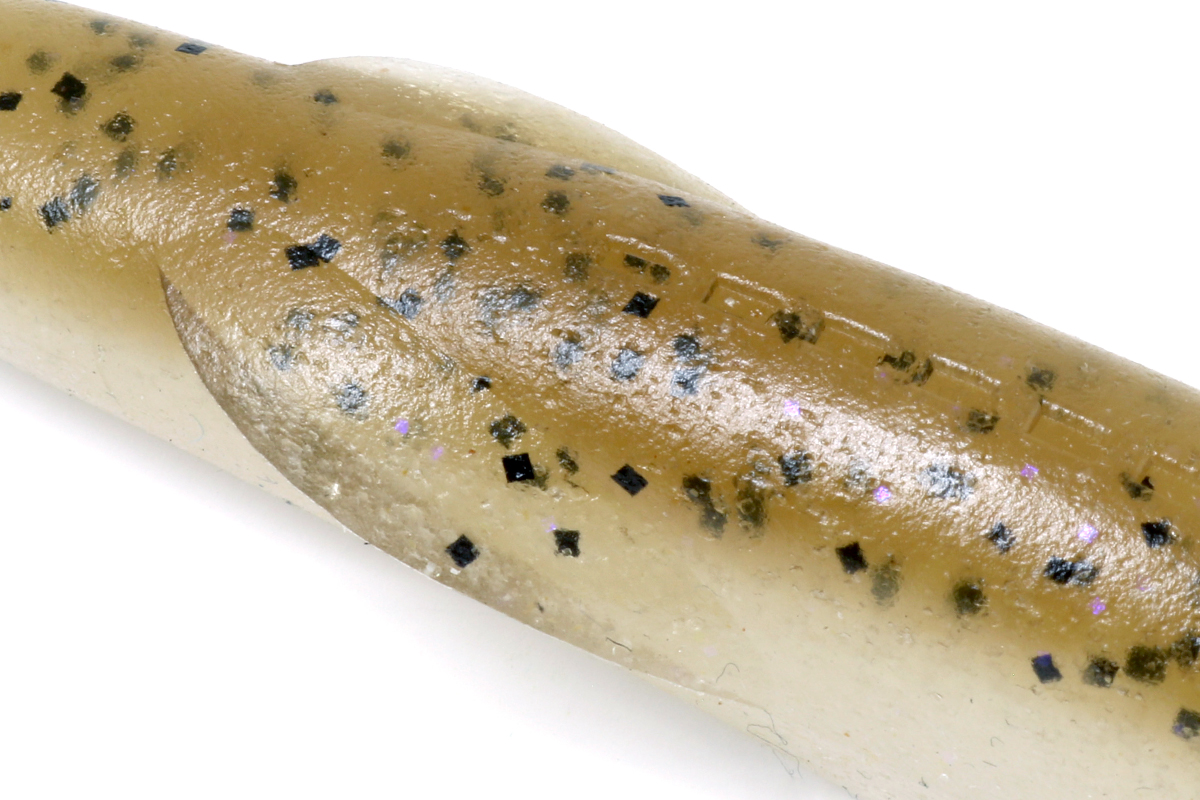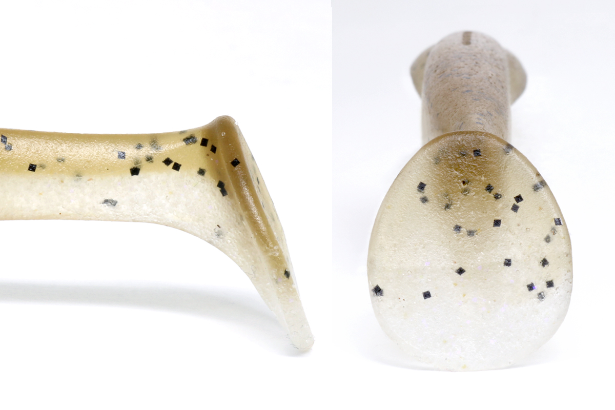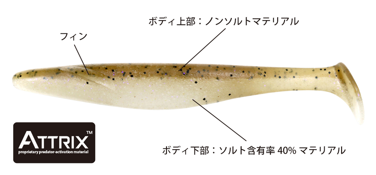 ソルト含有量マックスとなるボディ下部マテリアルによる低重心、また水掴みが良くスローからファストリトリーブまで対応のシャッドテールによる安定したスイム姿勢は、ノーシンカーやスイムジグトレーラーのスイミングはもとより、テキサスリグのズル引きなどレンジコントロールがし易く幅広いストライクゾーンを持ち備えるシャッドテールです。